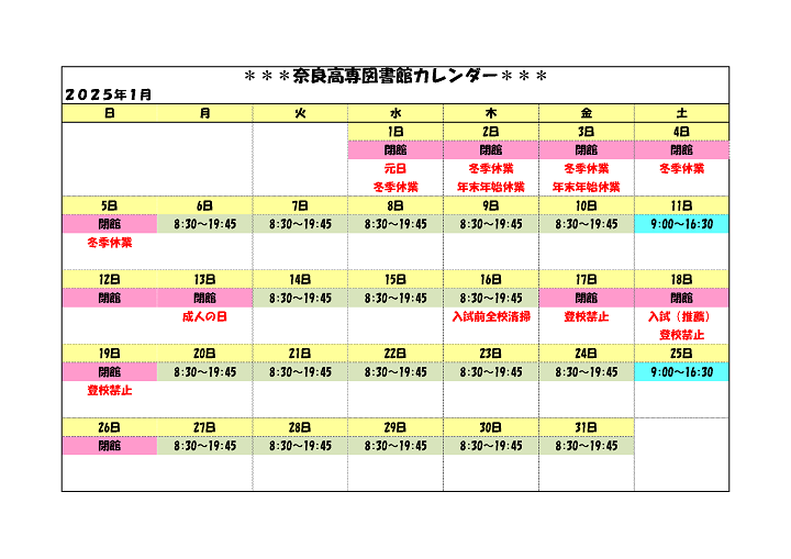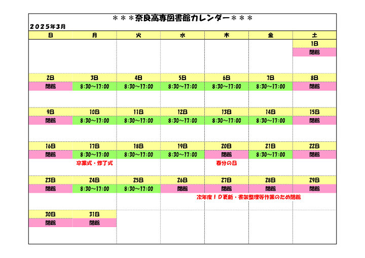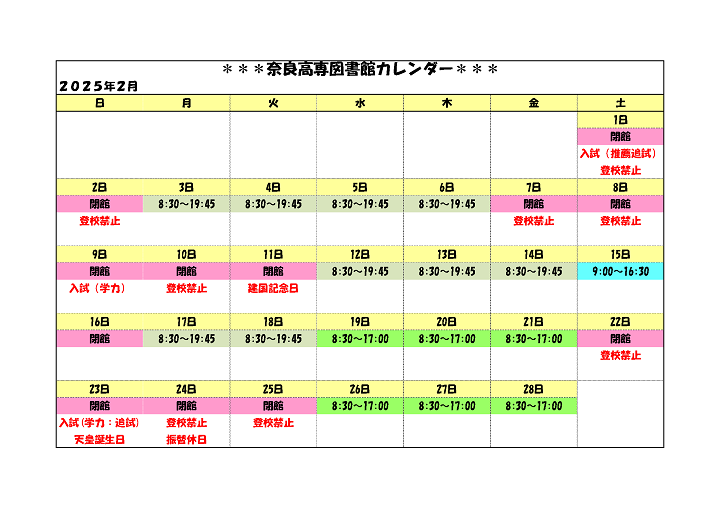 案内 開館カレンダー 奈良工業高等専門学校 図書館 〒639-1080 大和郡山市 矢田町22 TEL 0743-55-6015 FAX 0743-55-6018 E-Mail tosho[at]jimu.nara-k.ac.jp[at]を@に変えてから送信してください。
